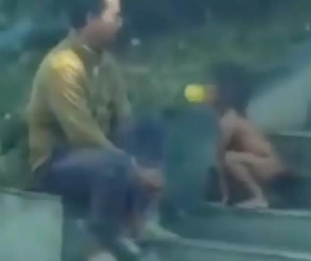 画面中野人小孩像动物一样"叼"起地上的食物,一旁的父亲无动于衷 / 图源网络视频截图