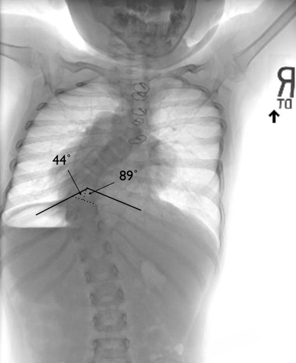 x 光片显示,患者由于脊柱变形,对肺部造成了压迫 / [ 8 ]